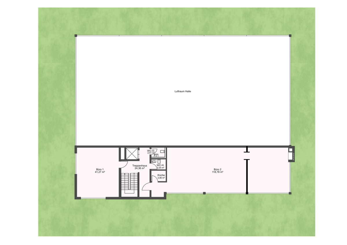 Hochwertige Hallen-/Produktionsfläche ca. 515 m², 6 m Hallenhöhe, Stahlkonstruktion, Außenwände in isolierten Zink-Sandwichelementen, Fenster Kunststoff isolierverglast, Heizung mit Gas-Dunkelstrahler. Druckluftanlage als Ringleitung, Andienung über 2 ebenerdige Tore. Pkw-Absauganlage (kann übernommen werden). 5 Pkw-Hebebühnen, antistatische Beschichtung der Bodenplatte. Dachkonstruktion: Betondecke mit Lichtelementen.