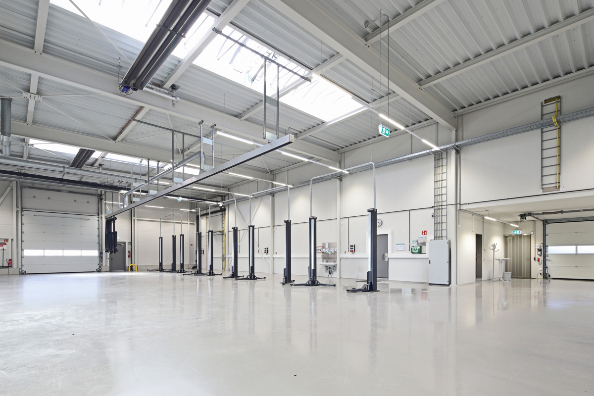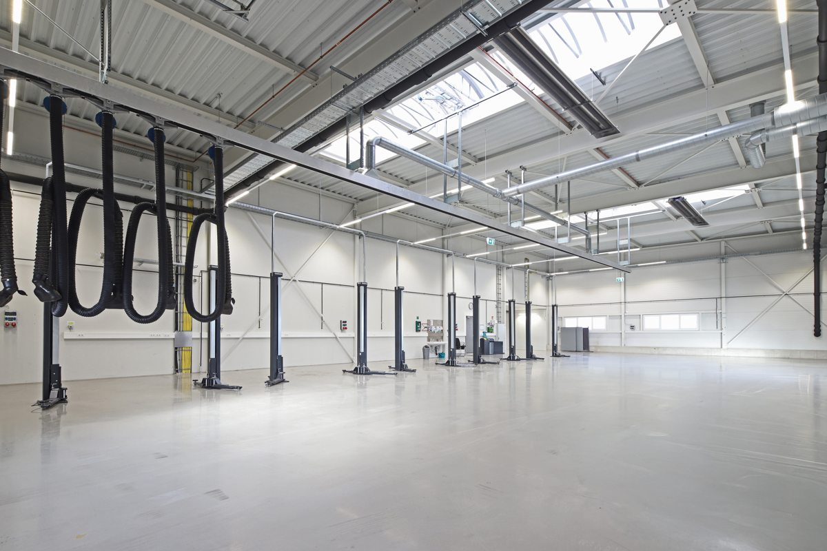 Hochwertige Hallen-/Produktionsfläche ca. 515 m², 6 m Hallenhöhe, Stahlkonstruktion, Außenwände in isolierten Zink-Sandwichelementen, Fenster Kunststoff isolierverglast, Heizung mit Gas-Dunkelstrahler. Druckluftanlage als Ringleitung, Andienung über 2 ebenerdige Tore. Pkw-Absauganlage (kann übernommen werden). 5 Pkw-Hebebühnen, antistatische Beschichtung der Bodenplatte. Dachkonstruktion: Betondecke mit Lichtelementen.