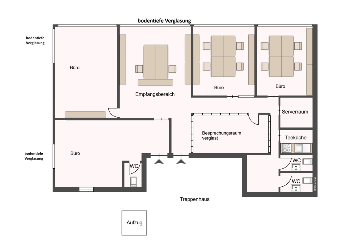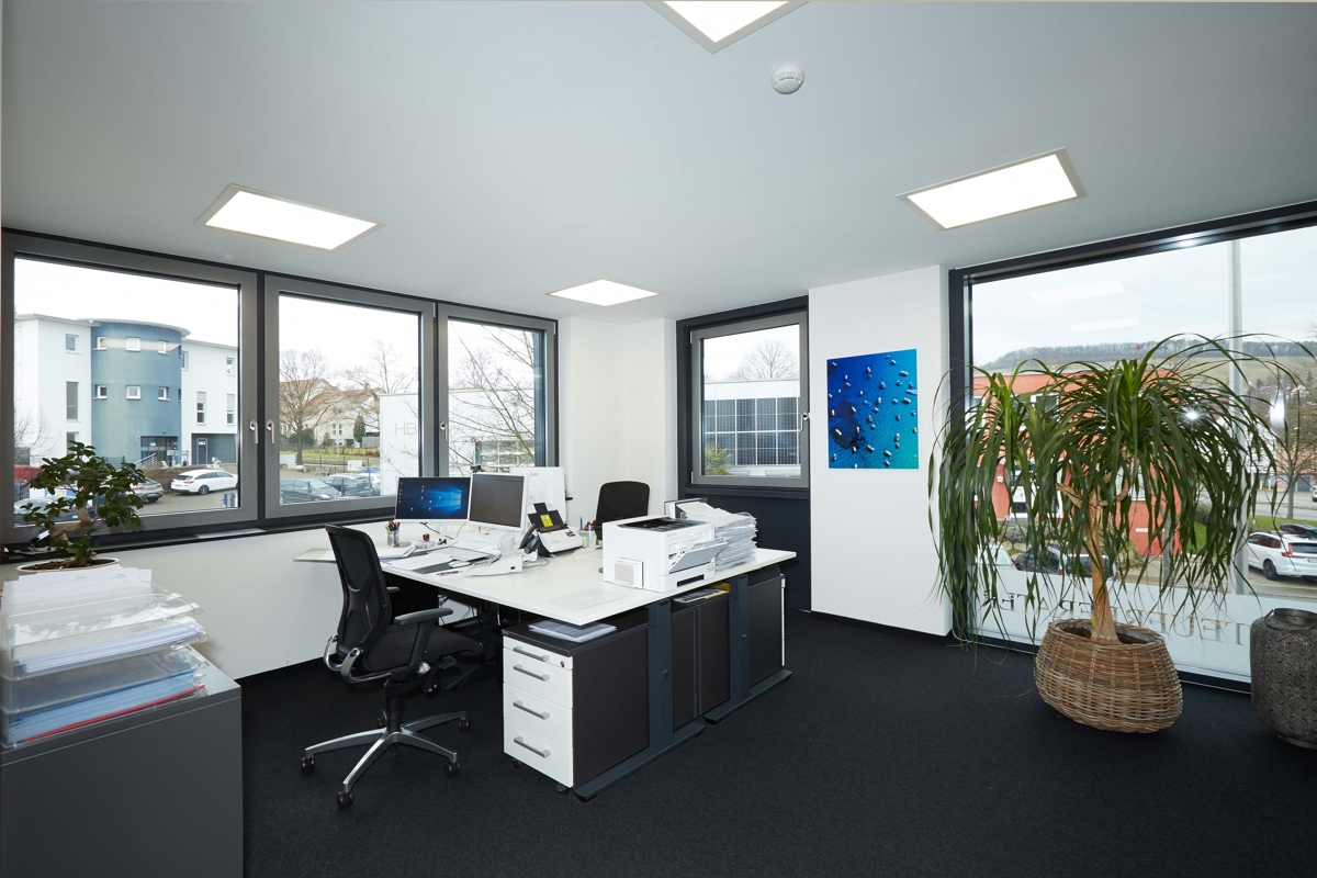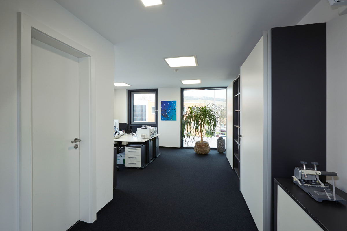 Empfangsbereich, drei Büroräume, ein separater Bürobereich mit eigenem WC und Zugang. Keller/Archivraum ca. 60 m².