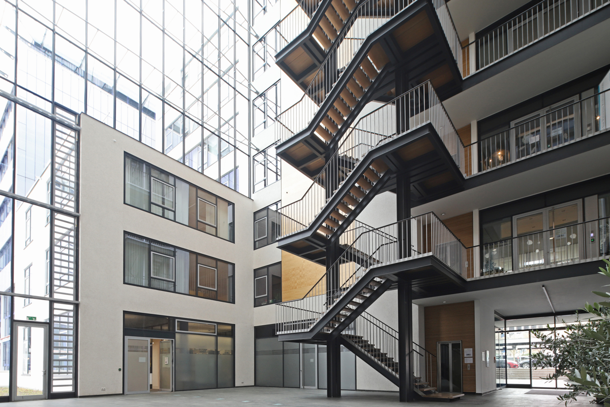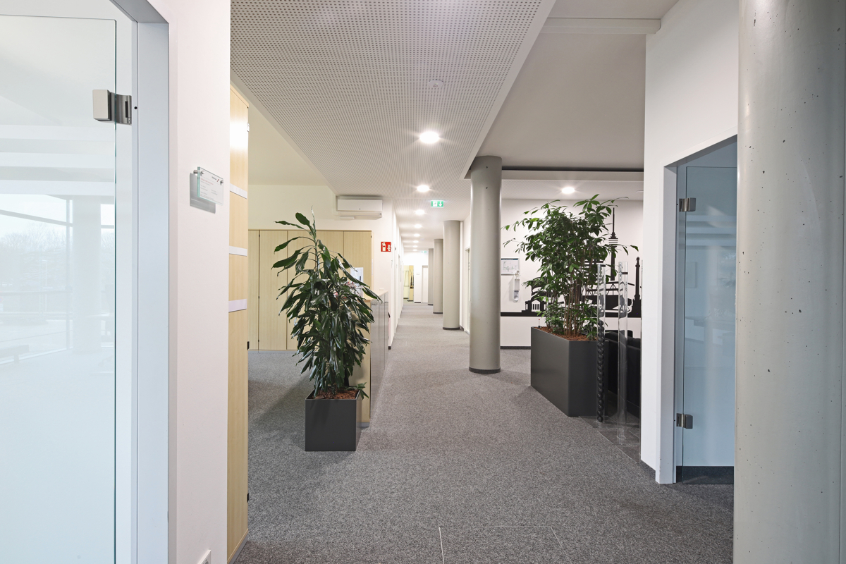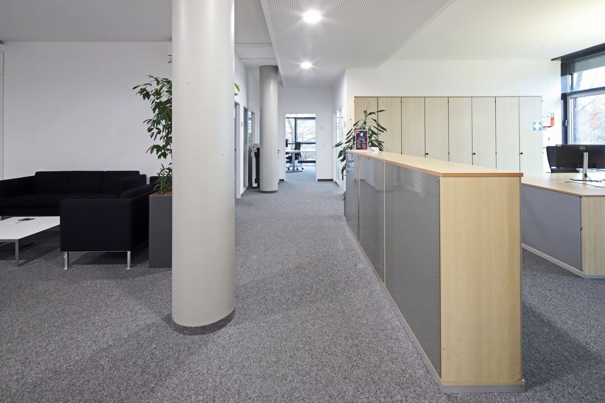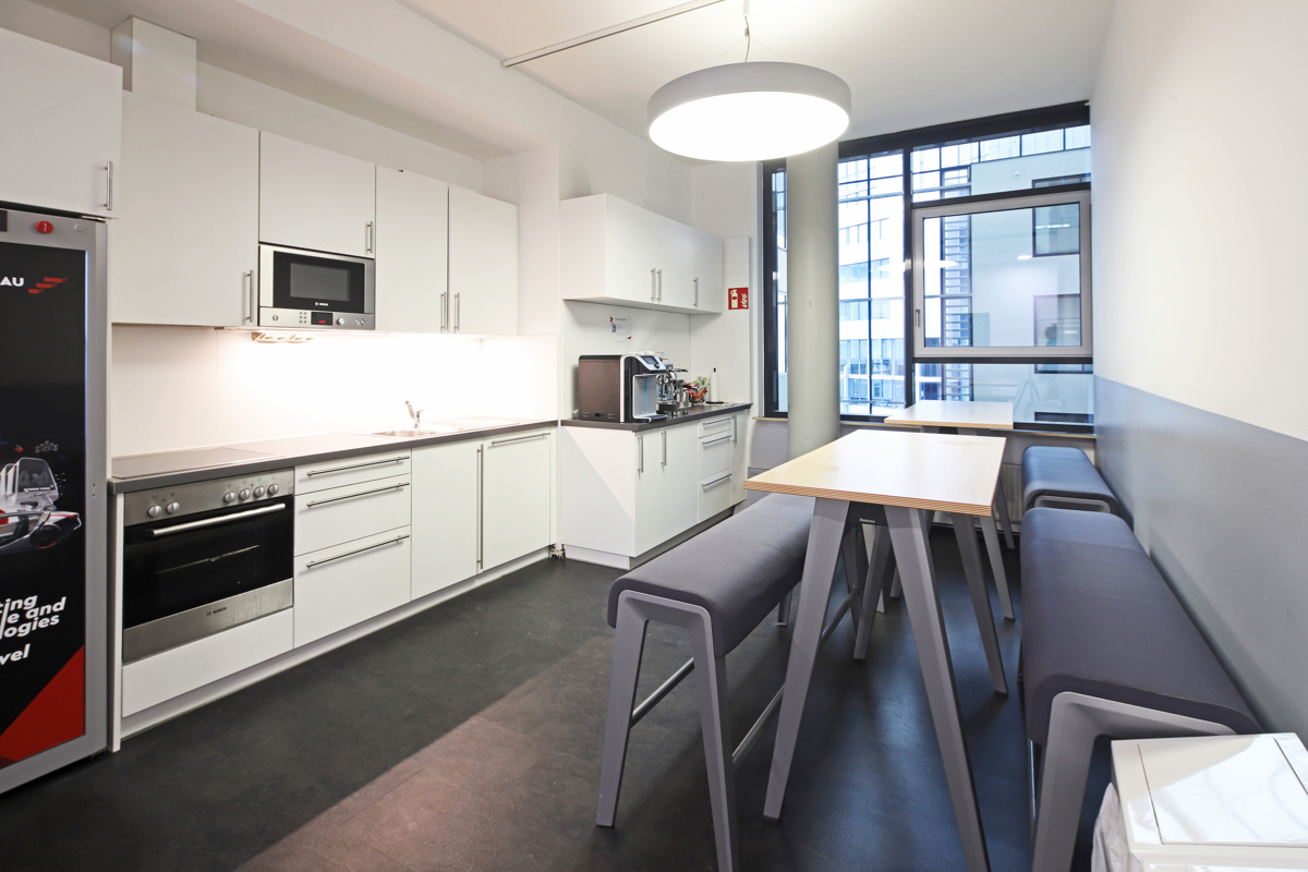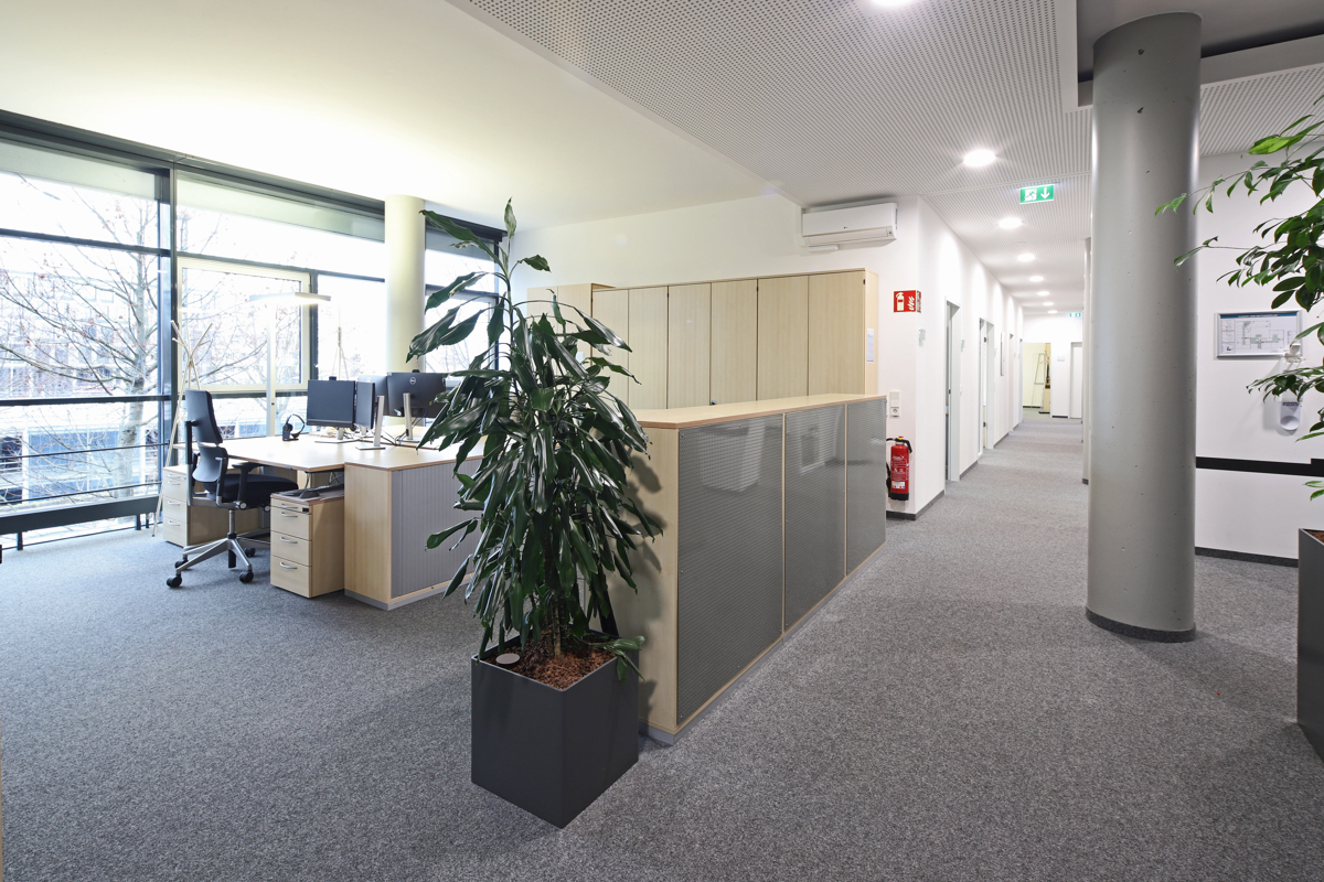 Helle Büroflächen durch Vollverglasung in einem Bürokomplex mit Teeküche, Aufenthaltsraum sowie sanitären Anlagen.