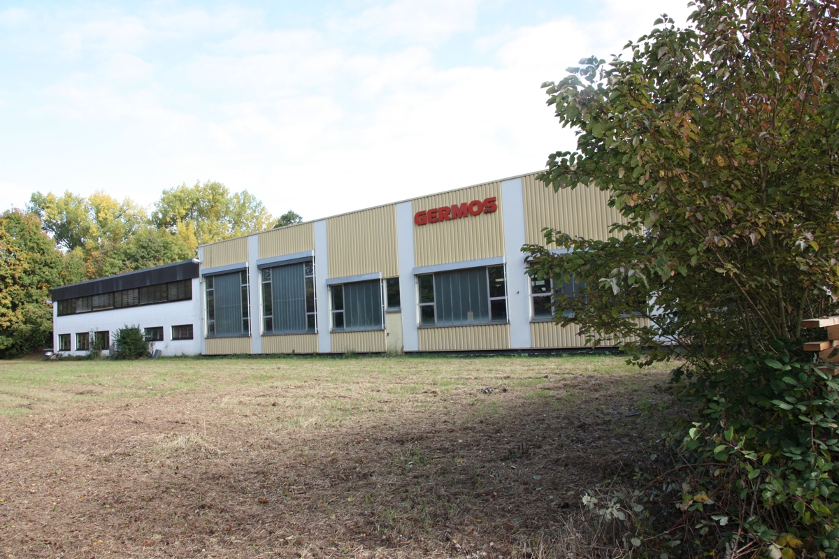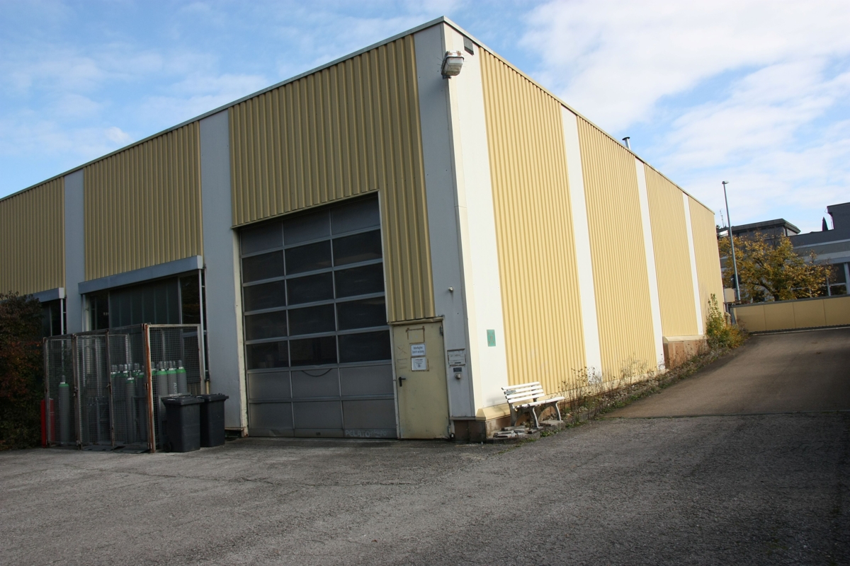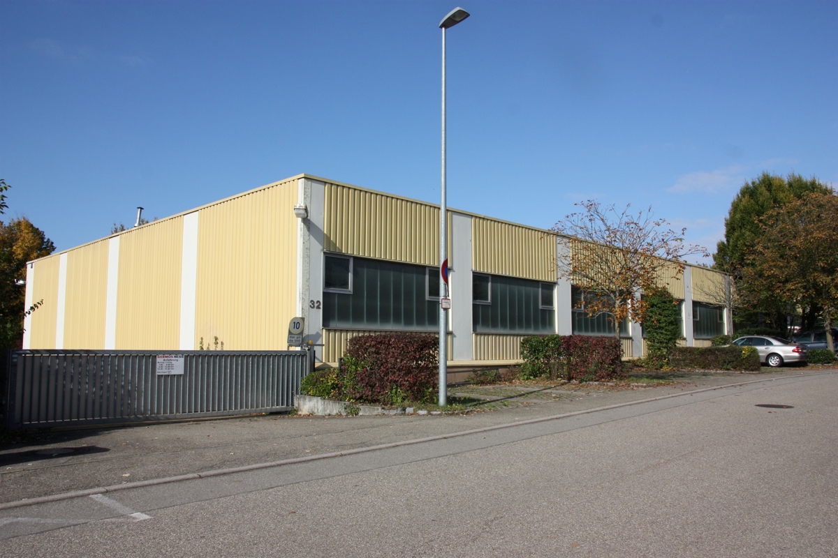 Lager- und Produktionshalle mit Bürotrakt, freistehend, Baujahr 1988, Grundstücksgröße 4.991 m². Nach den Angaben im Baugesuch von 1986 im Gewerbegebiet gelegen, dort Randlage, direkte Anbindung an die B 29.