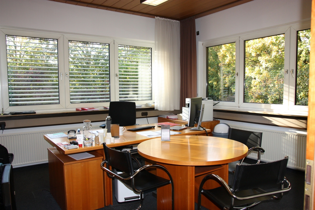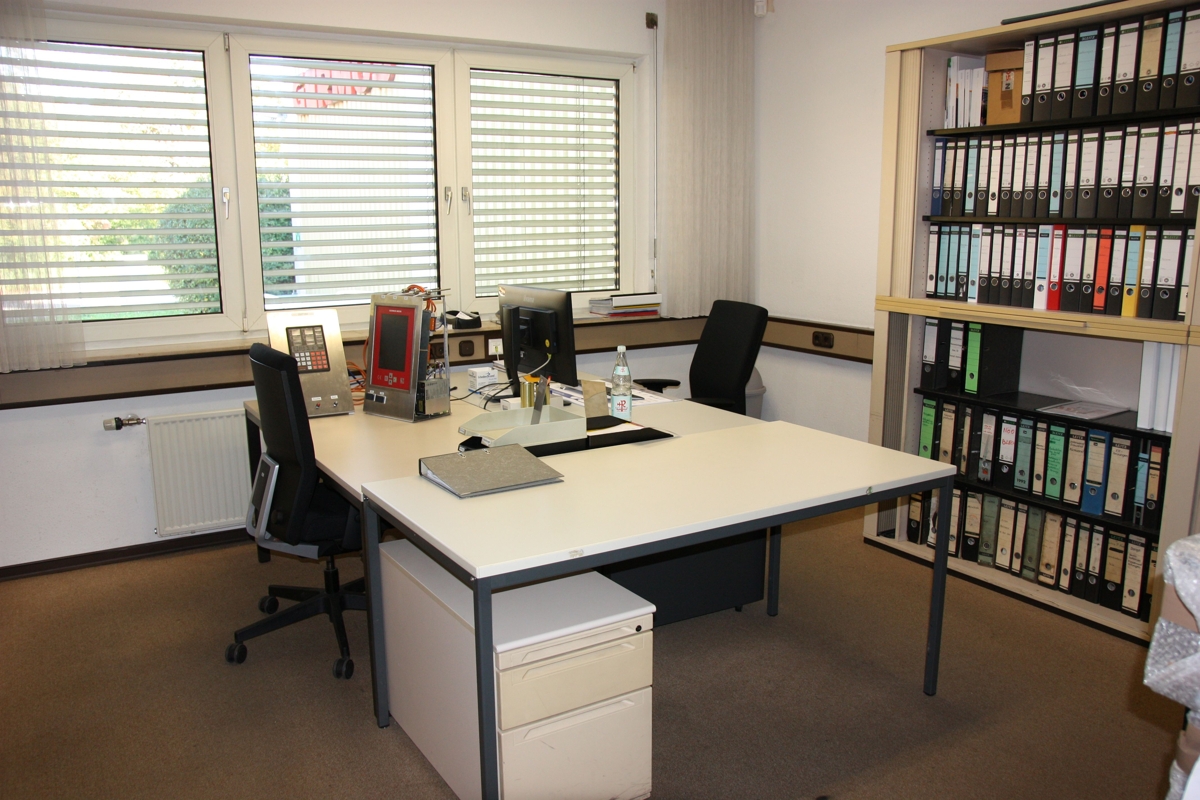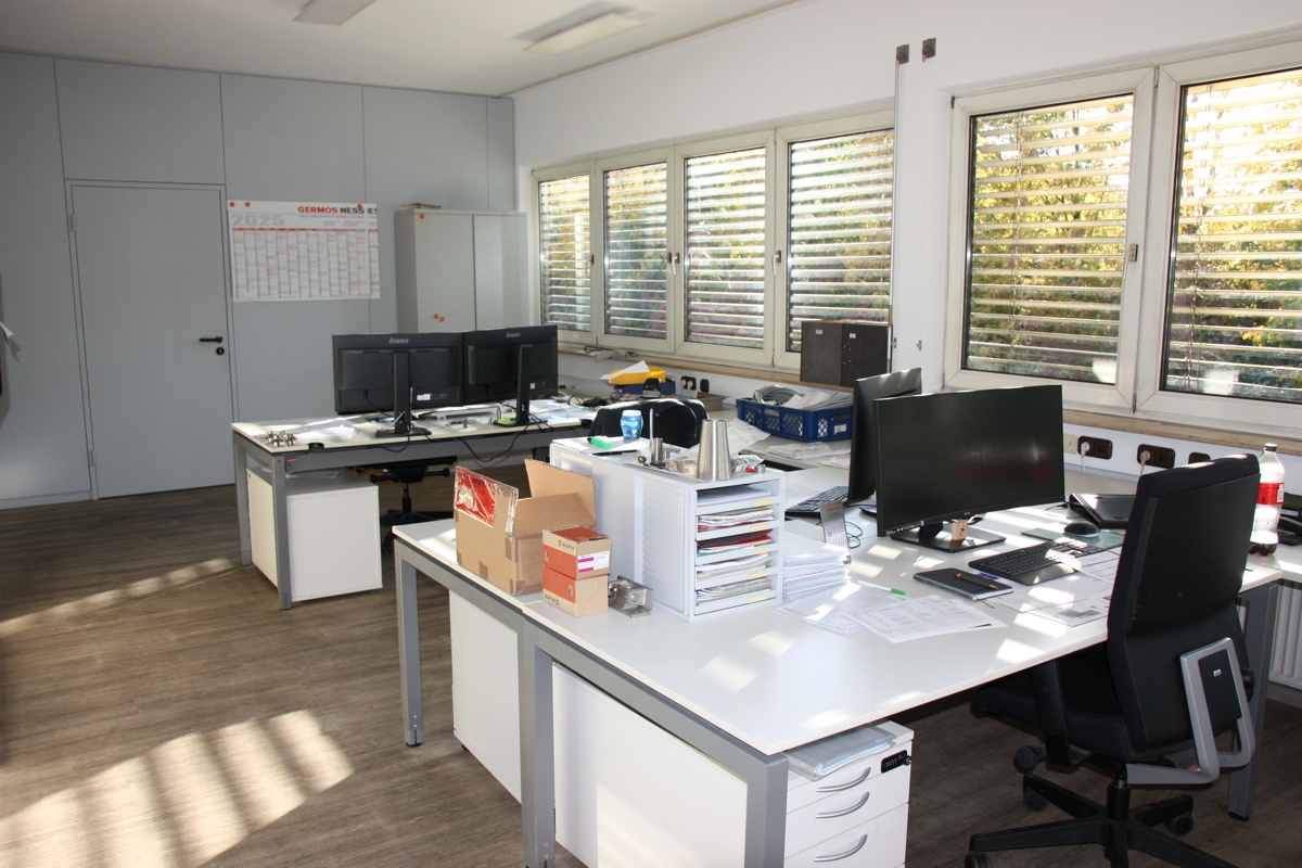 Massive Bauweise, der Bürotrakt erstreckt sich über zwei Etagen, wobei in der unteren Etage bedingt durch die leichte Hanglage die Räume auf der West- und Nordseite Tageslicht haben. Fenster in Aluminium-Kunststoff aus dem Baujahr, Außenjalousien. Massives Bitumenflachdach mit Oberlichtern. Gas-/Zentralheizung.
