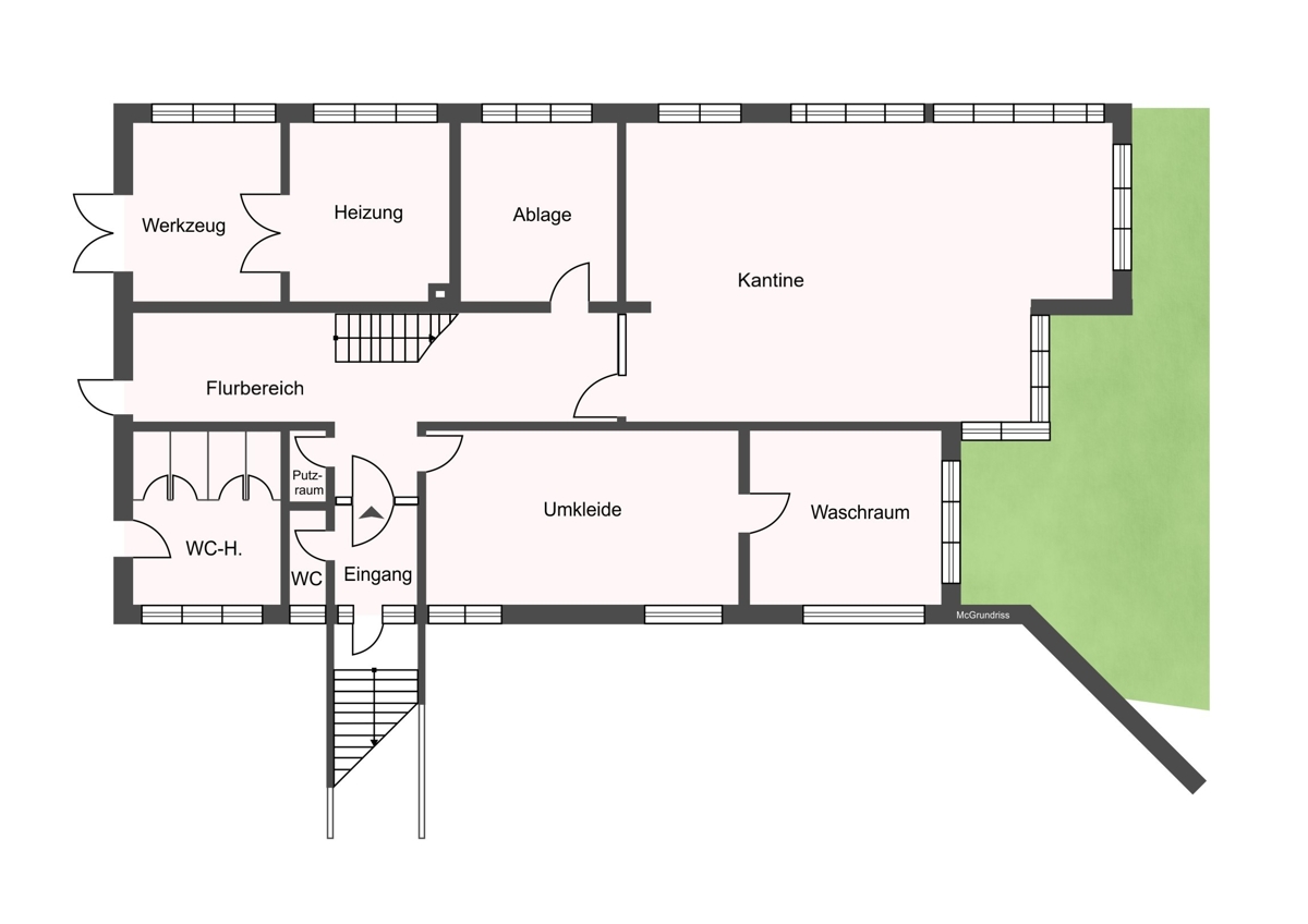 Bedingt durch ein leichtes Gefälle befindet sich die Toreinfahrt in die Halle auf der Rückseite des Gebäudes. Dort ist die Einfahrtsebene der Halle gleich dem Bodenniveau des Untergeschosses des Bürotraktes. Der Eingangsbereich zum Bürotrakt liegt mit leichtem Höhenversatz auf Straßenniveau.