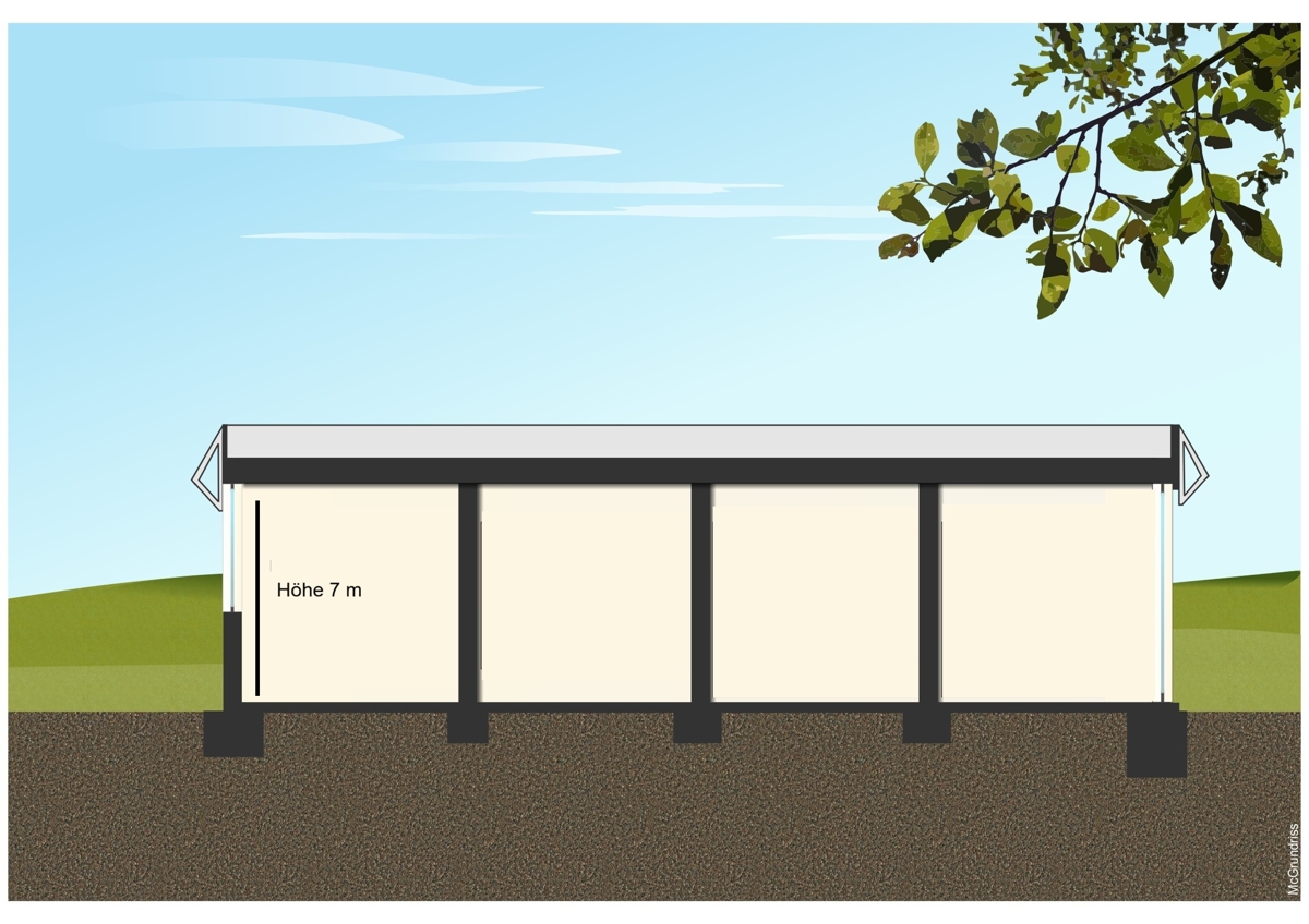 Konstruktion in Stahlskelettbauweise mit Metall- und Glaselementen ausgefacht. Trapezblechbedachung mit Oberlichtern und Flachdachisolierung (Das Flachdach wurde 2023 mit einer Bitumenabdichtung saniert.). Hallenhöhe ca. 7 m, Kranbahn mit 5 t Traglast in 5 m Höhe, Rolltor, ebene Zufahrt