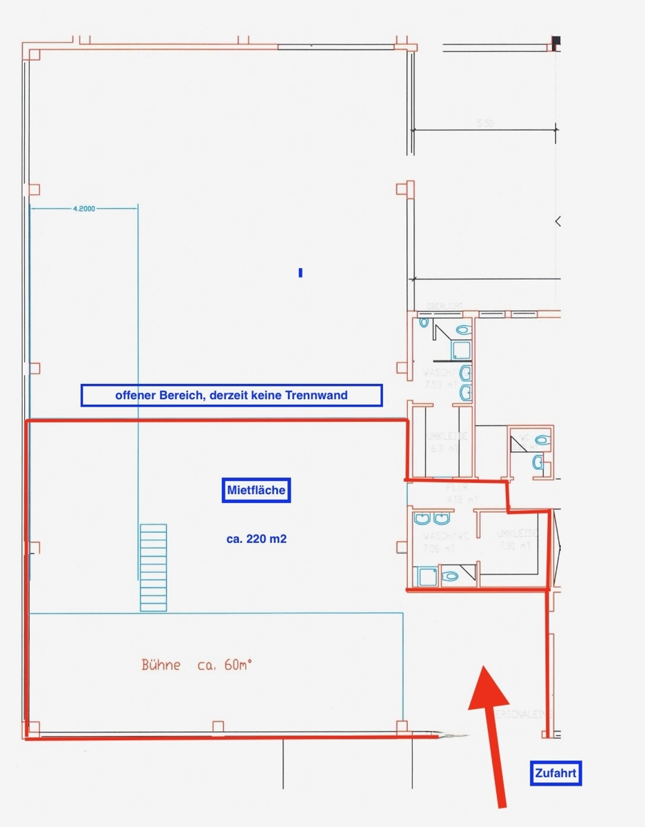 Angeboten wird eine Teilfläche einer Halle. Ca. 220 m2 Nutzfläche, was ungefähr die Hälfte der Halle ausmacht. Der andere Teil der Halle wird von einem von einem metallverarbeitenden Betrieb genutzt.