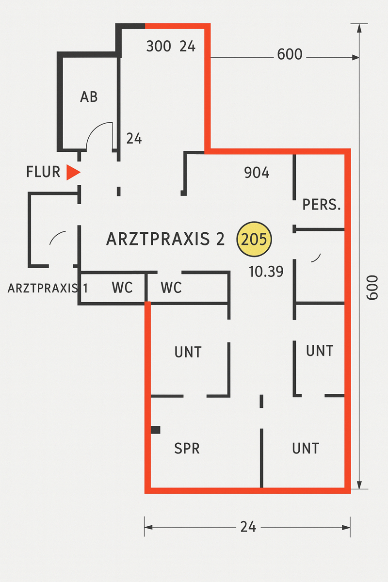 Praxisflächen 2.OG, 6 Räume, 2 WC´s, ,