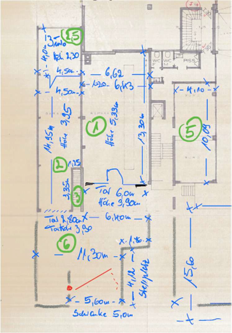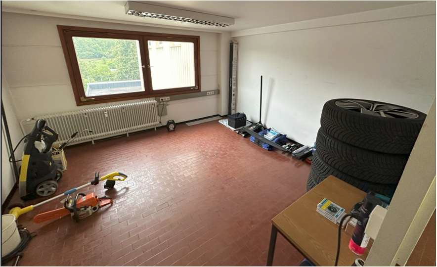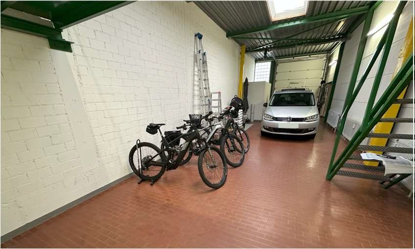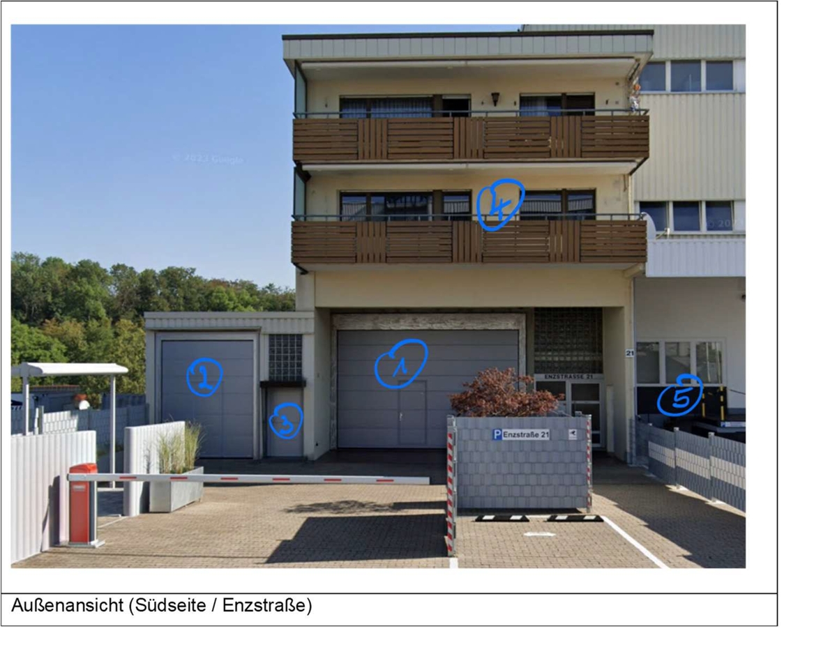Im EG/ebenerdig/befahrbar ca. 86 m² Gewerbefläche, Einfahrt über Sektionaltor (3,9 m x 6 m), Montiergrube. Weitere Gewerbefläche mit ca. 63 m² (Sektionaltor 2,8 m x 3,9 m) und Büro- und Lagerflächen insgesamt ca. 81 m². Gesamtfläche insgesamt ca. 230 m². Zugang zu den Gewerbeflächen über das Treppenhaus oder die Schlupftüre im Sektionaltor.