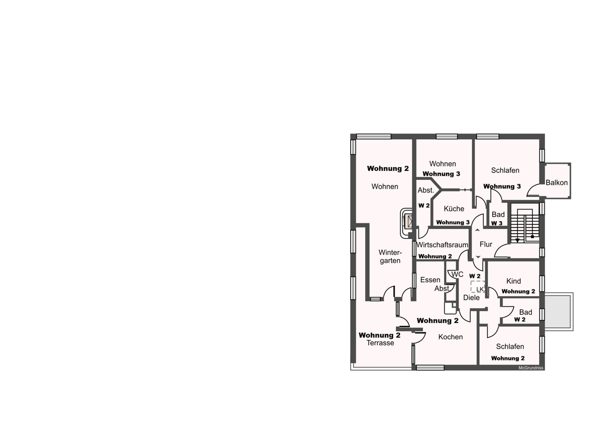 Im Obergeschoss befinden sich drei Wohnungen, die über zwei getrennte Treppenhäuser erschlossen werden: