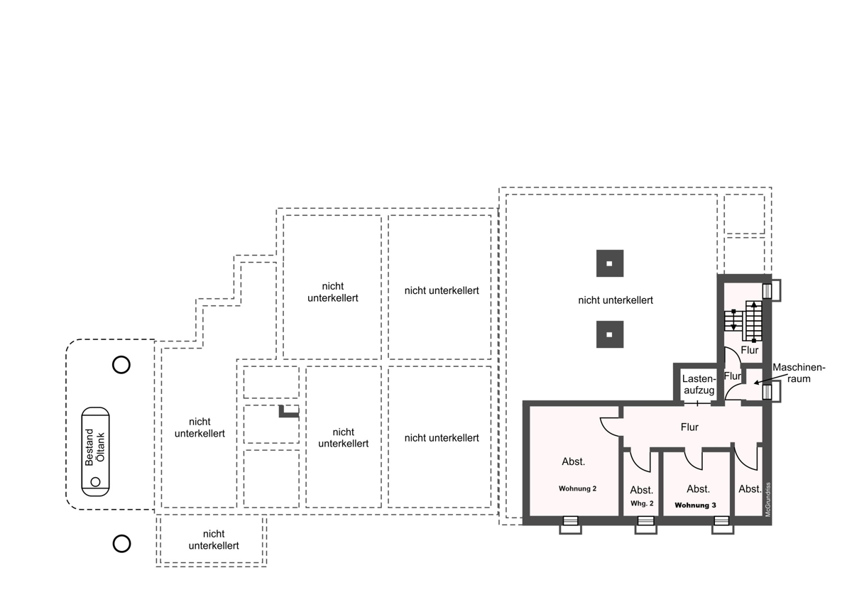 Das Anwesen ist teilunterkellert; im östlichen Gebäudeteil befinden sich ca. 95 m² Keller- und Lagerfläche im UG, die mit einem Lastenaufzug mit dem EG verbunden ist.