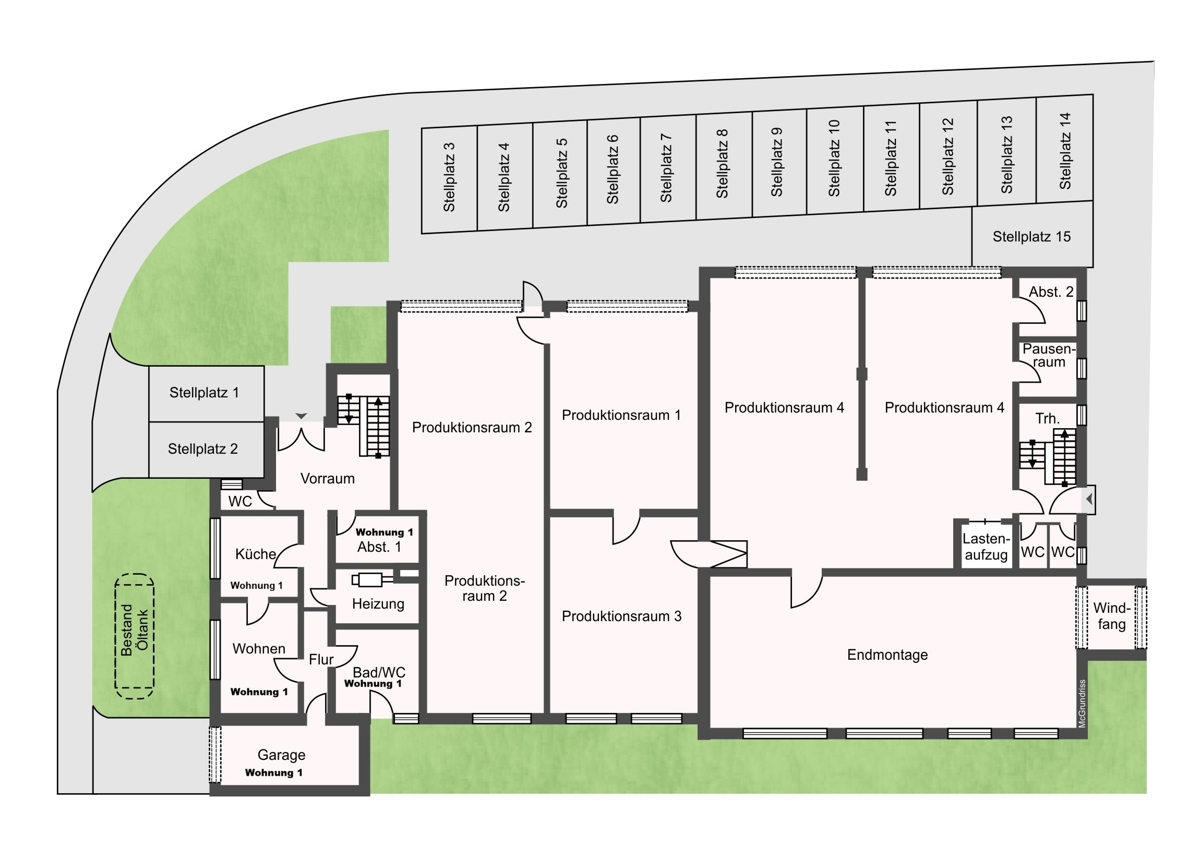 Neben den 14 genehmigten Stellplätzen gibt es zusätzlich noch eine Garage. Die zwei Stellplätze an der der Westseite wurden nicht erstellt.